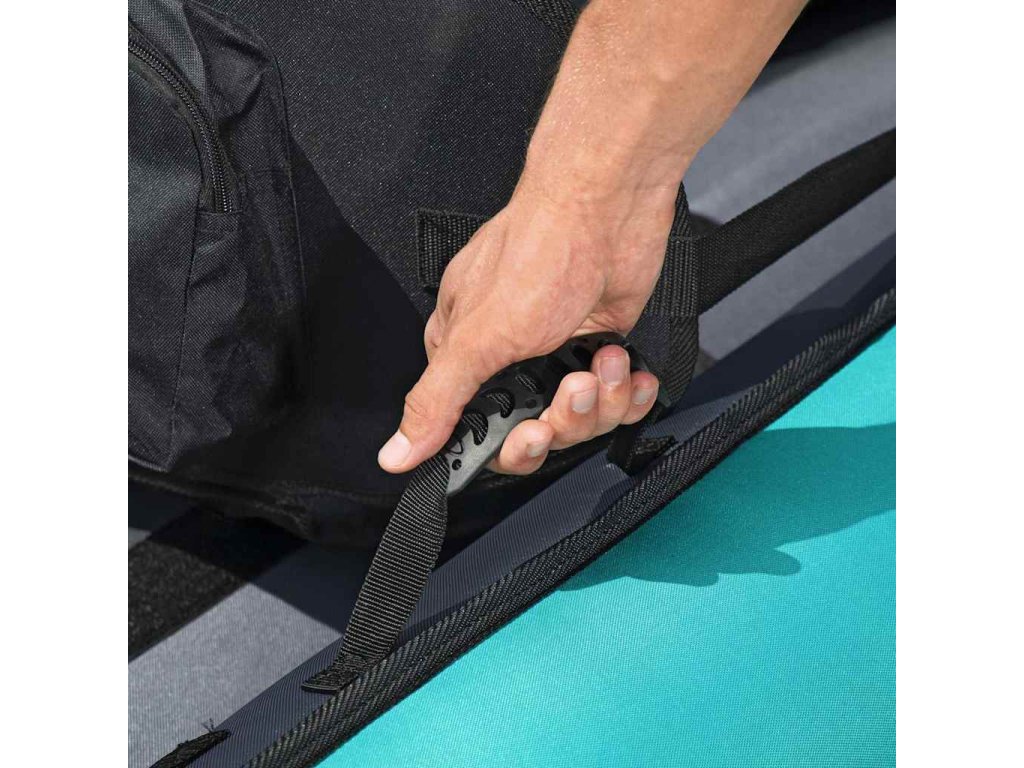 Loď je vybavená 2 nastaviteľnými sedadlami s úložnými priehradkami, vďaka čomu je ideálna pre vaše dobrodružstvá s kamarátom. Hliníkové veslá s dvoma čepeľami môžete bezpečne uchytiť pomocou úchytov na veslá. Po úplnom nafúknutí pomocou ručnej pumpy Air Hammer je kajak dlhý 3,3 m a unesie až 200 kg.