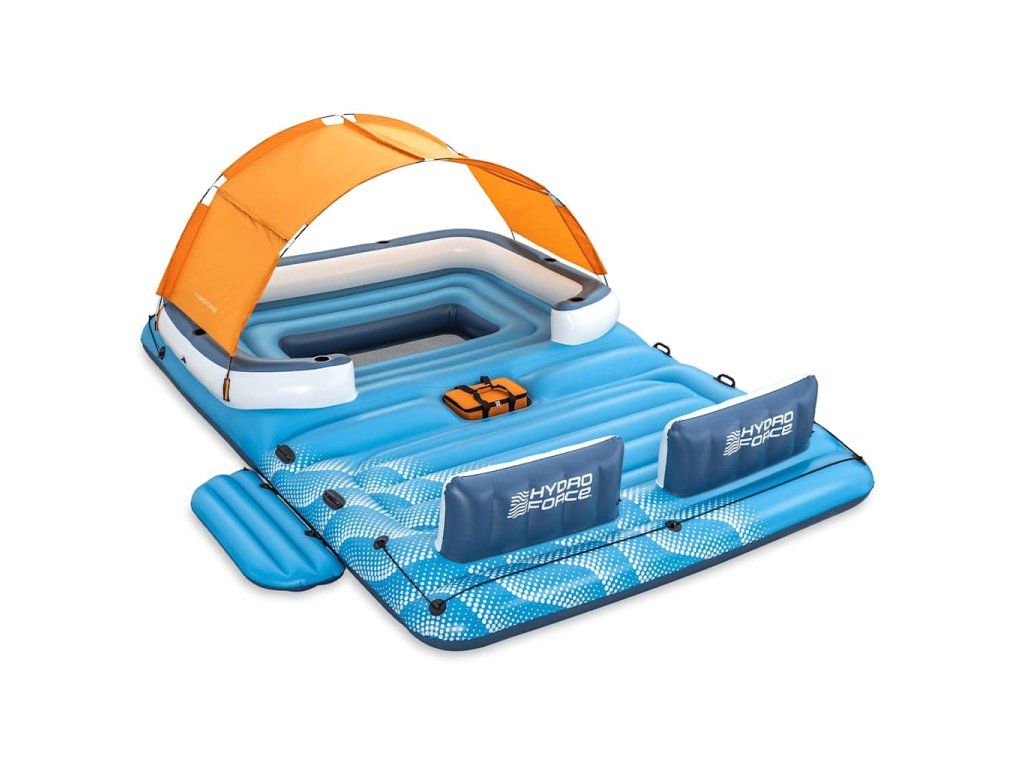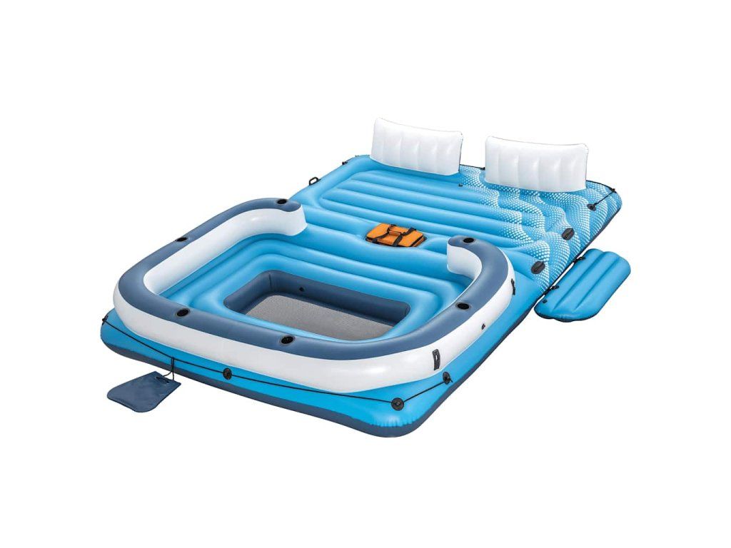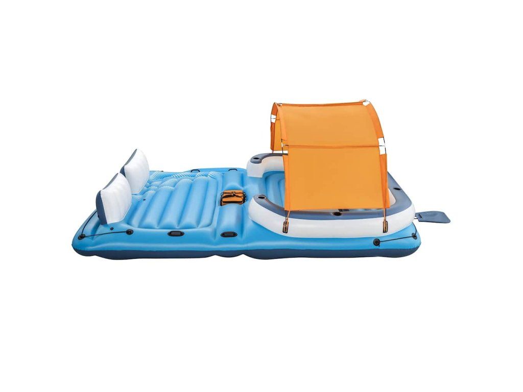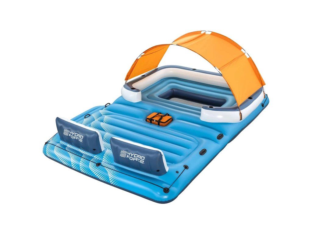 Nafukovacie ležadlo má extra široké operadlá tvorené vankúšmi a 6 vstavaných držiakov na poháre. Súčasťou balenia je aj chladiaca taška, ktorá sa postará o to, aby nápoje zostali vychladené a aby ste ich mali vždy poruke. Na oboch koncoch ostrovčeka sa nachádajú laná, ktorých sa môžete držať, a na plošine nájdete robustné rukoväte. Odnímateľná strieška, ktorá je súčasťou balenia, vám poskytne príjemné miesto v tieni, kde budete chránení pred škodlivým slnečným UV žiarením.