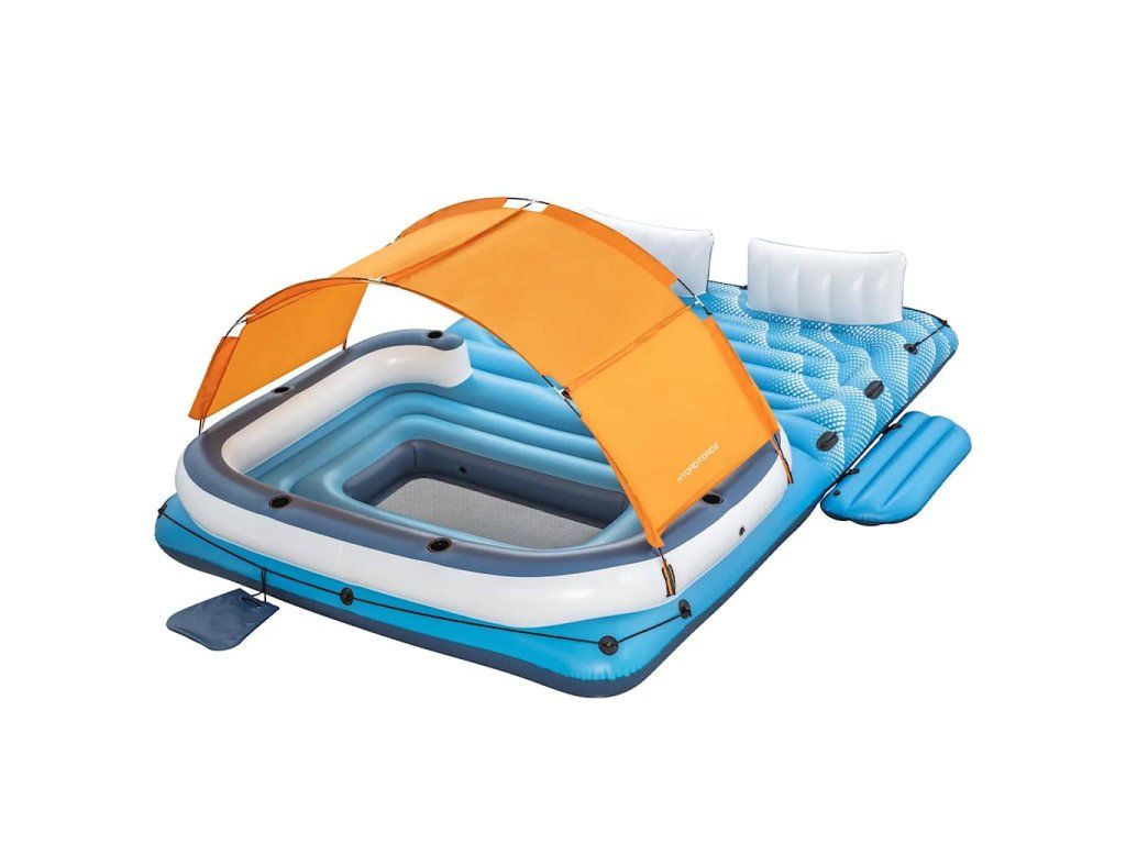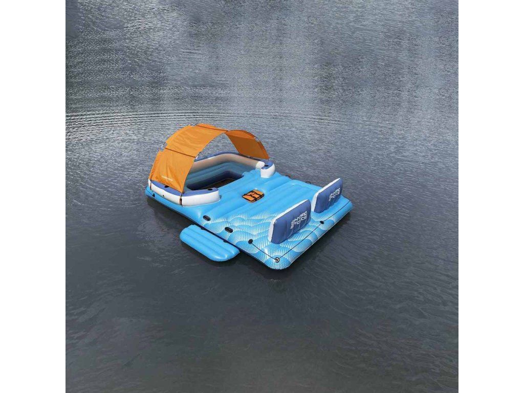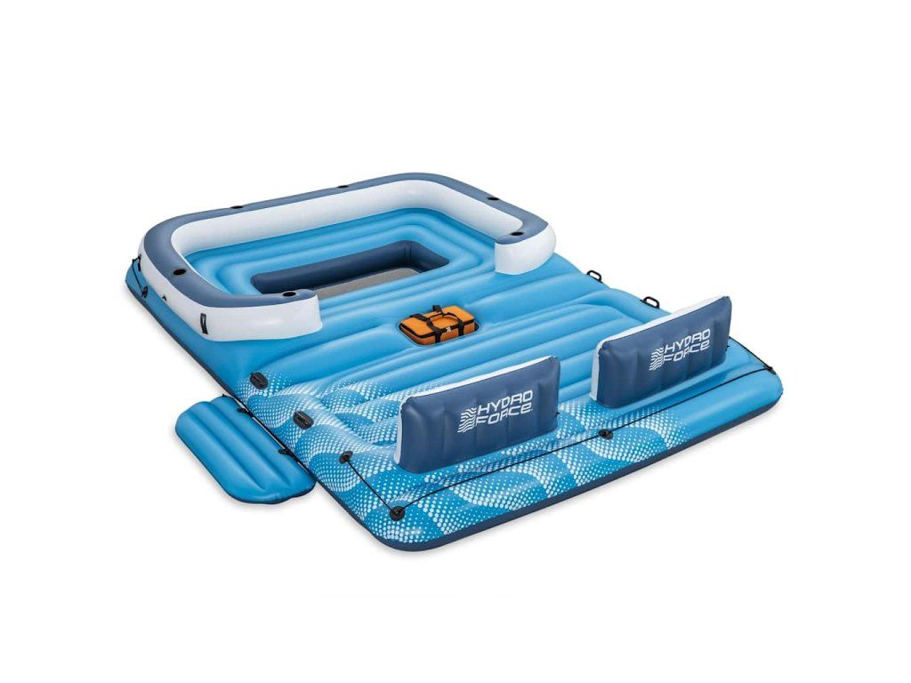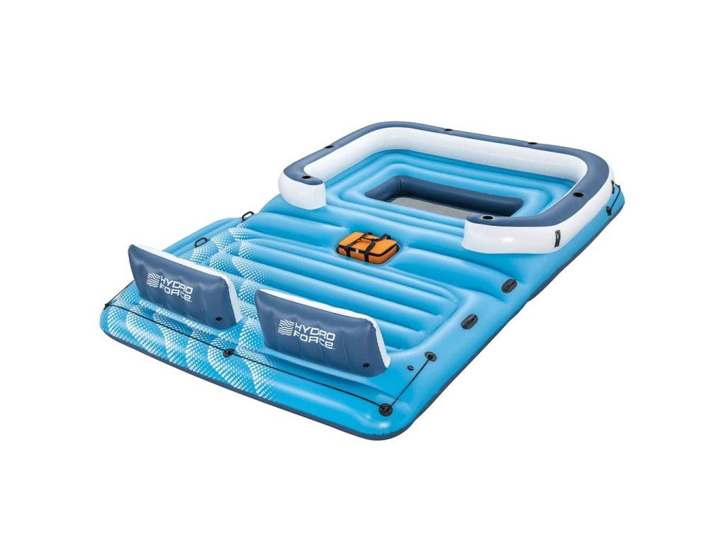 Nafukovacie ležadlo má extra široké operadlá tvorené vankúšmi a 6 vstavaných držiakov na poháre. Súčasťou balenia je aj chladiaca taška, ktorá sa postará o to, aby nápoje zostali vychladené a aby ste ich mali vždy poruke. Na oboch koncoch ostrovčeka sa nachádajú laná, ktorých sa môžete držať, a na plošine nájdete robustné rukoväte. Odnímateľná strieška, ktorá je súčasťou balenia, vám poskytne príjemné miesto v tieni, kde budete chránení pred škodlivým slnečným UV žiarením.