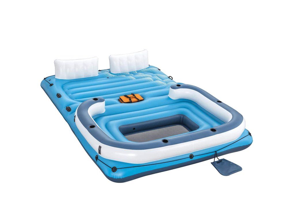 Tento nafukovací ostrov je vyrobený z vysokokvalitného vinylu, takže je veľmi trvácny a dostatočné pevný na to, aby vás udržal na hladine. Pohodlne sa naň zmestí až 6 osôb a jeho maximálna nosnosť je 540 kg.