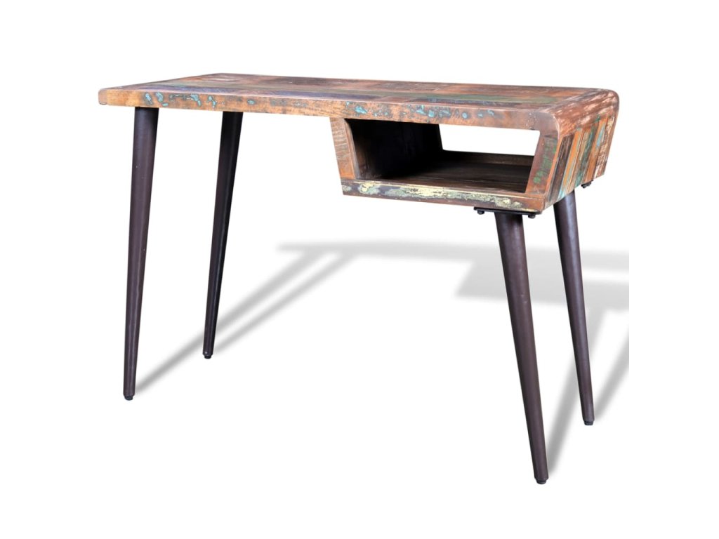 Tento písací stôl má vrchnú dosku z recyklovaného dreva a 4 trvácne železné nohy a predstavuje nadčasový doplnok do domácnosti. Vrchná doska z dreveného masívu poskytuje stabilné a bezpečné miesto, kam si môžete položiť poháre, vázy, misku s ovocím alebo rôzne dekorácie. Pod doskou sa nachádza priečinok, ktorý posúži ako praktický úložný priestor.