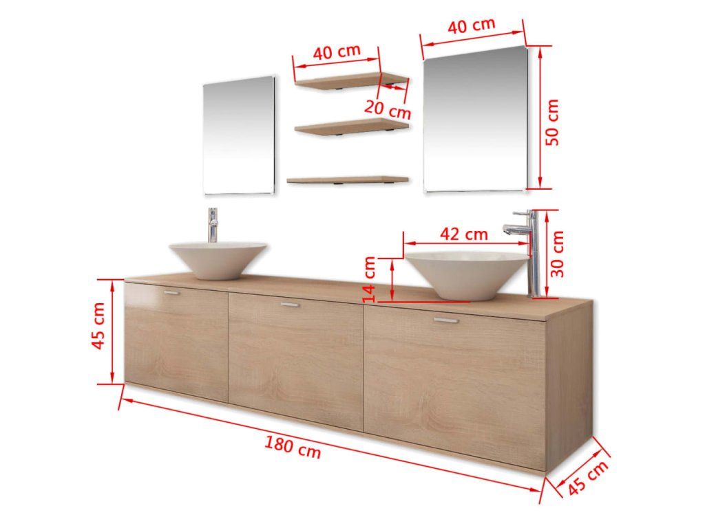 Táto kompletná sada pozostáva z 1 nástennej skrinky pod umývadlo, 2 zrkadiel, 3 políc, 2 umývadiel a 2 batérií a predstavuje skvelý spôsob, ako si zariadiť kúpeľňu a zároveň jej dodať štýlový vzhľad.