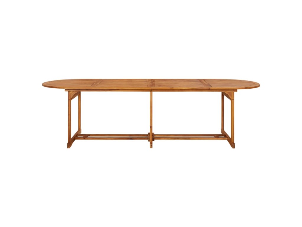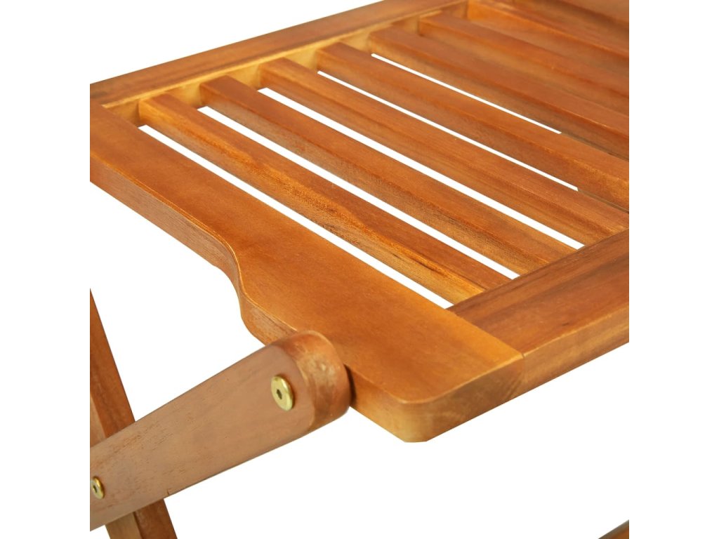 Vonkajšia jedálenská súprava je vyrobená z akáciového masívu, tropického tvrdého dreva, ktoré je trvácne a odolné voči poveternostným vplyvom, a tak vám vydrží dlhé roky. Povrch s olejovým náterom sa dá ľahko očistiť navlhčenou handričkou. Stoličky na terasu sa navyše dajú poskladať do kompaktných rozmerov, aby nezaberali veľa miesta, keď ich nepoužívate.