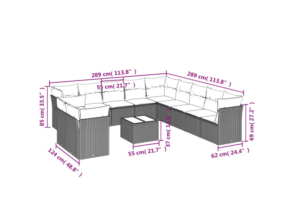 - Celkové rozmery 9-miestnej pohovky: 289 x 289 x 69 cm (Š x H x V)