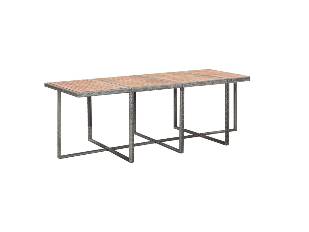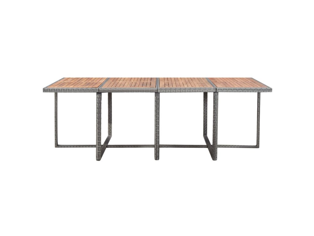 Táto ratanová jedálenská sada s elegantným dizajnom bude skvelou voľbou pre večere na čerstvom vzduchu či relaxovanie na záhrade. Majú oceľové rámy s práškovým náterom a tak sú stôl, stoličky a taburetky pevné a robustné. Vďaka ich ľahkej konštrukcii je možné všetky časti súpravy jednoducho presúvať. Polyratan je vodeodolný a odolný voči vplyvom počasia a jedálenská sada sa tak ľahko čistí. Vrch stola z akáciového dreva s prírodným olejovým náterom sa ľahko čistí pomocou navlhčenej handričky.