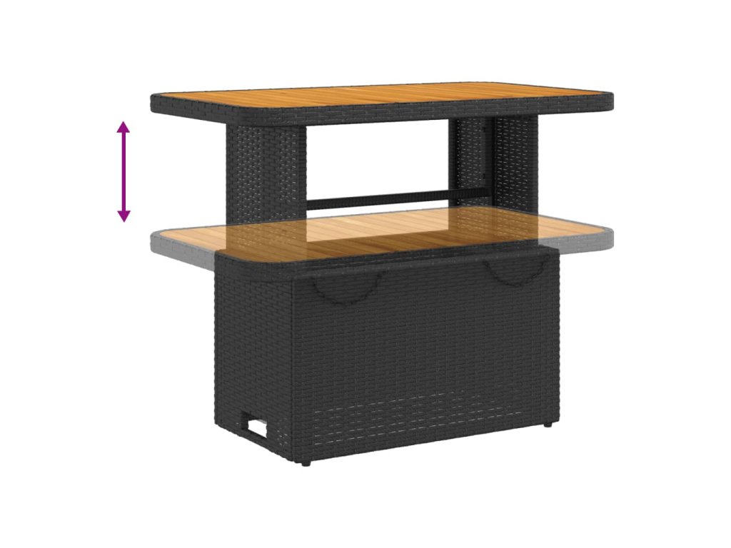 - Nastaviteľná stolová doska: Stolová doska sa dá zdvihnúť, aby bol stôl vyšší, čím sa vonkajší stôl zmení z konferenčného na jedálenský. Je ideálny na pozvanie hostí alebo jedenie vonku.