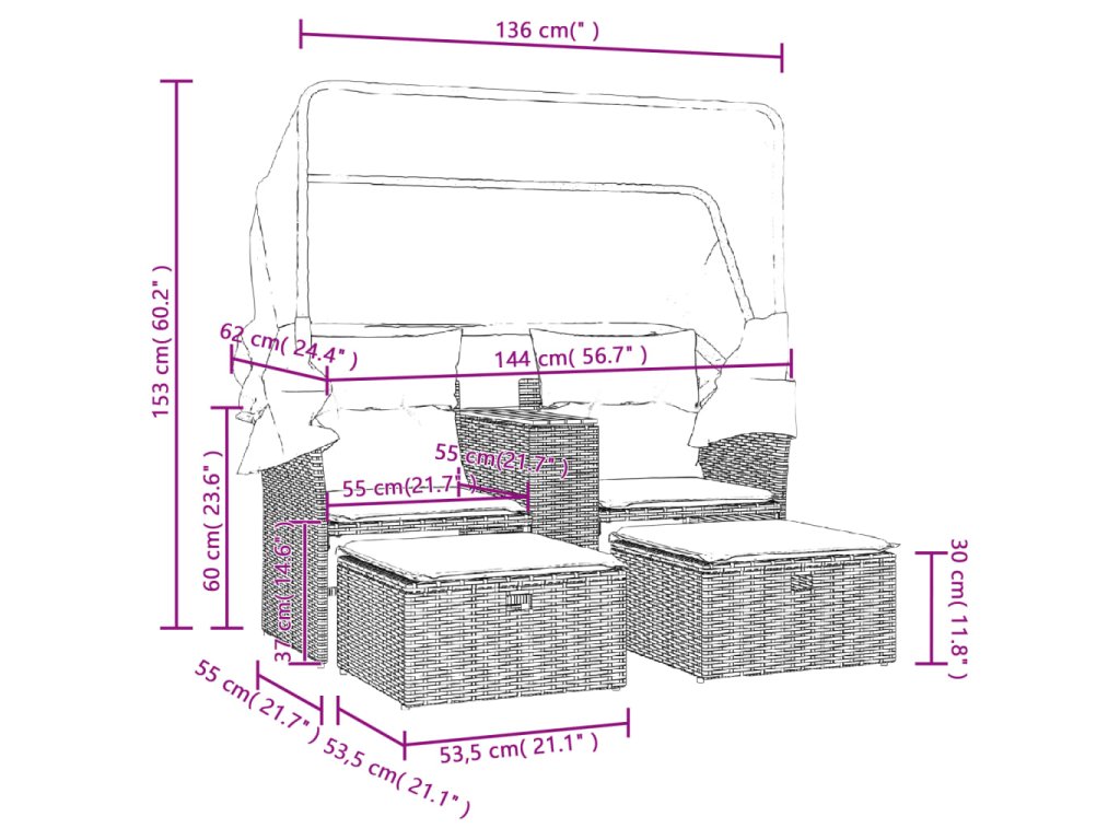 Táto záhradná pohovka so strieškou a taburetkami je dokonalým doplnkom na váš dvor, terasu alebo verandu, a poskytuje pohodlný a príjemný priestor na rozhovory s rodinou a priateľmi alebo jednoducho na relaxáciu a užívanie si pobytu vonku.