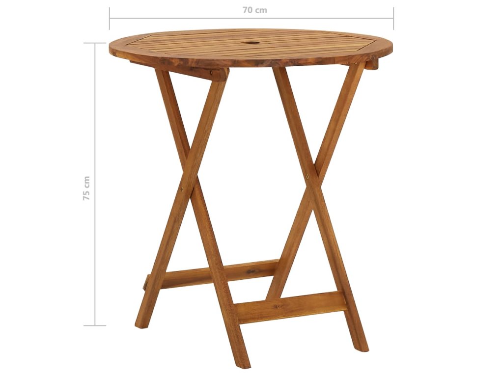 Táto jedálenská súprava je vyrobená z masívneho akáciového dreva, vďaka čomu je pevná a stabilná. Povrch upravený olejovým náterom sa ľahko čistí vlhkou handričkou. Okrem toho má táto stolová doska v strede dieru na slnečník. Jedálenský stôl a stoličky je možné sklopiť, aby ste ušetrili miesto, keď sa práve nepoužívajú.
