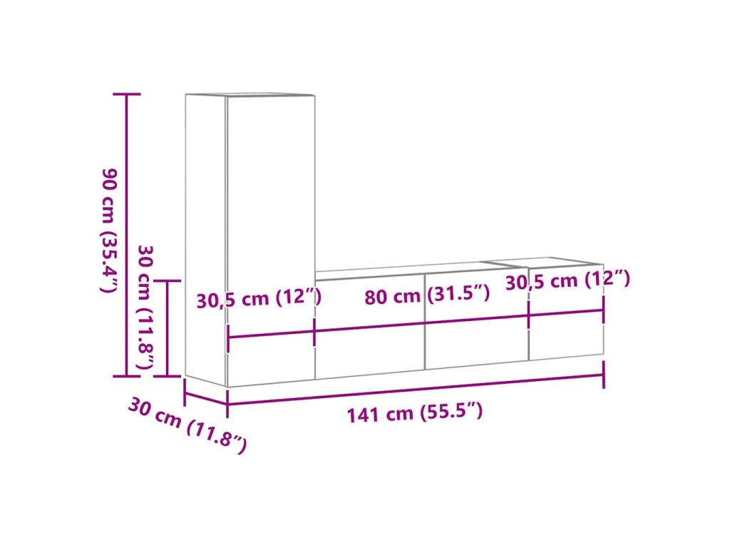 - 1 x TV skrinka: 30,5 x 30 x 90 cm (Š x H x V)