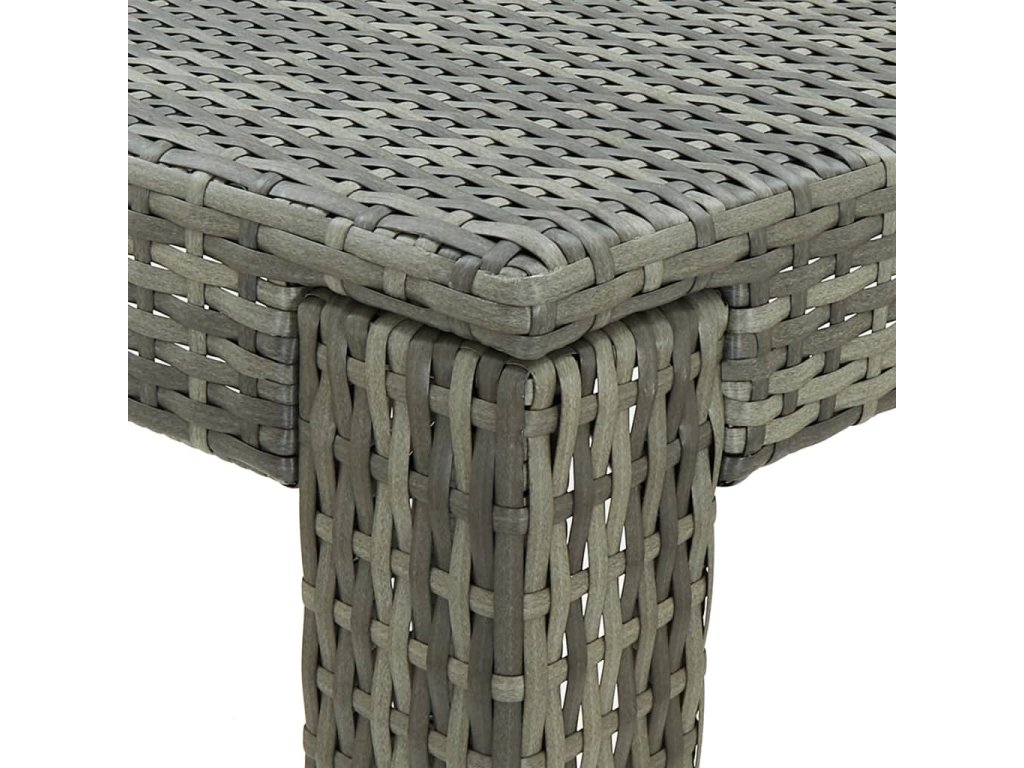 Barový stôl je opatrený oceľovým rámom s práškovanou povrchovou úpravou, vďaka čomu je stabilný a odolný. Štvorcová stolová doska je ideálna na položenie nápojov, jedla alebo dekoratívnych predmetov. Stoličky majú pevnú konštrukciu z oceľového rámu a sú vyrobené z PE ratanu odolného voči poveternostným vplyvom, čo zaisťuje ich stabilitu a ľahké premiestňovanie. Vankúš a opierka nôh tiež zvyšujú pohodlie pri sedení na stoličke. Poťah vankúša z polyesteru so skrytým zipsom uľahčuje čistenie.