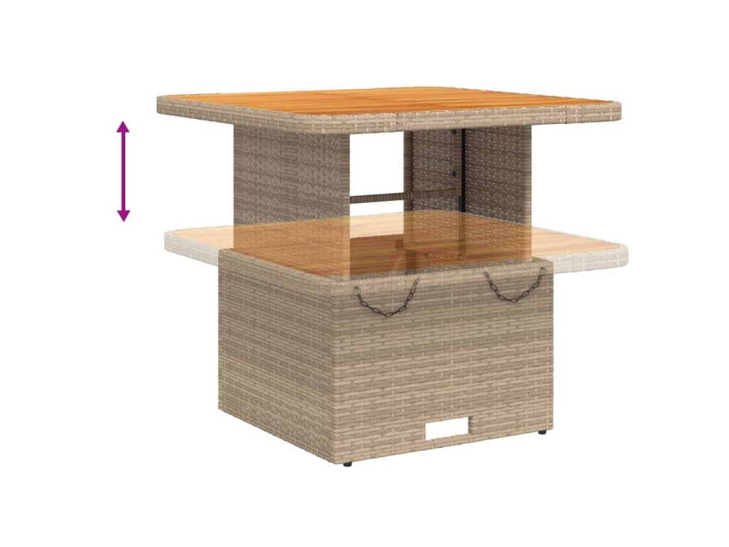 - Nastaviteľná stolová doska: Stolová doska sa dá zdvihnúť, aby bol stôl vyšší, čím sa vonkajší stôl zmení z konferenčného na jedálenský. Je ideálny na pozvanie hostí alebo jedenie vonku.