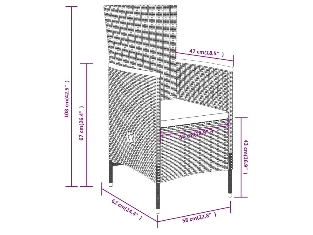 - Rozmery stoličky v zloženom stave: 58 x 62 x 108 cm (Š x H x V)