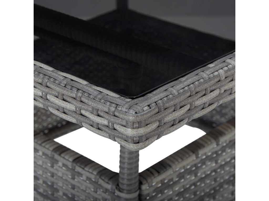 - Materiál: Polyratan, oceľ, sklo, látka (100% polyester)