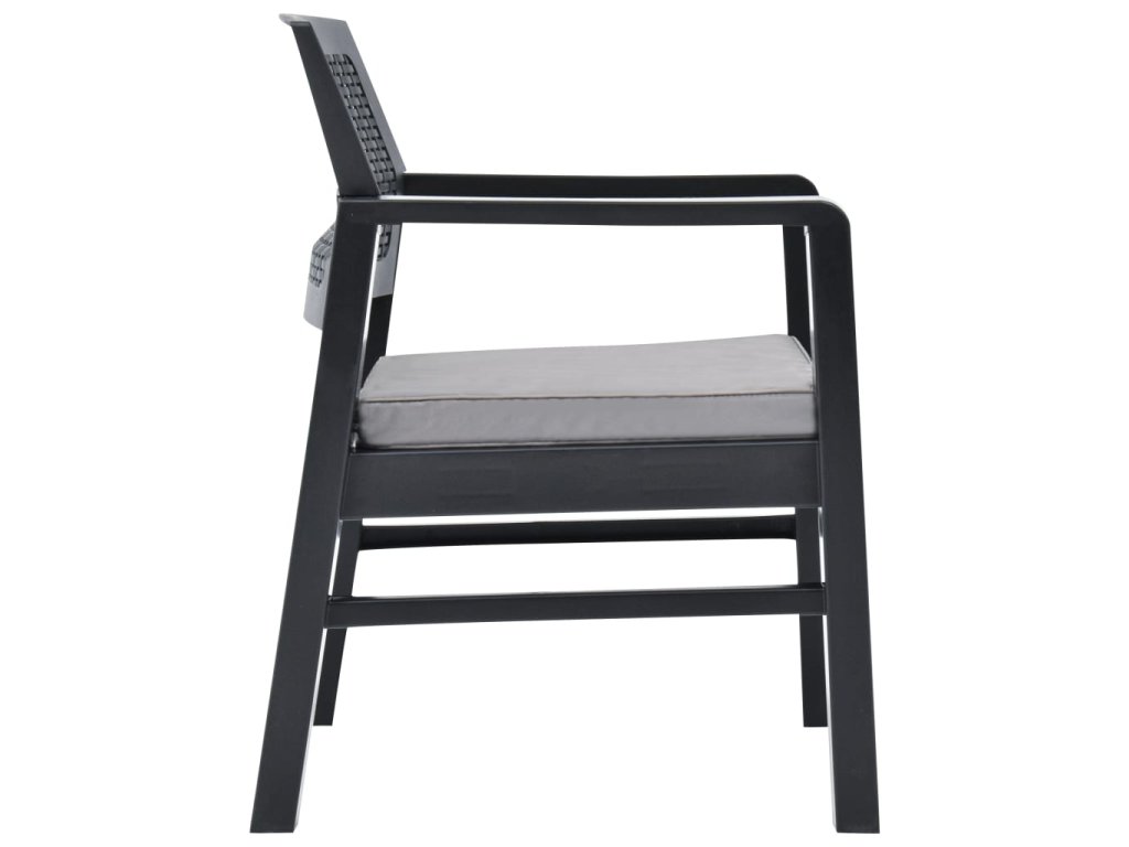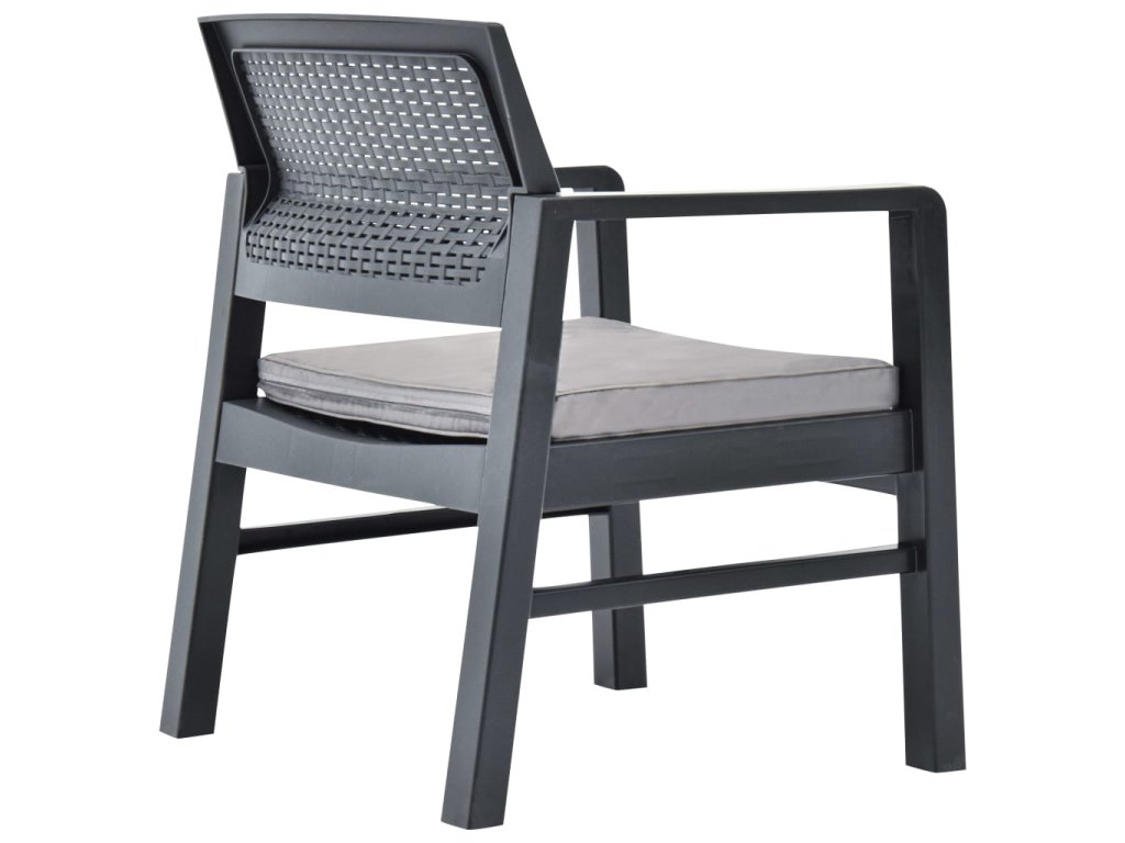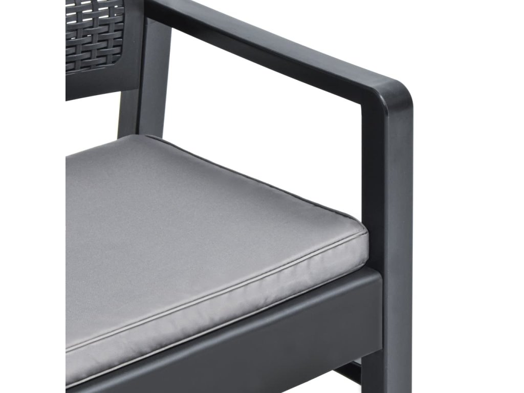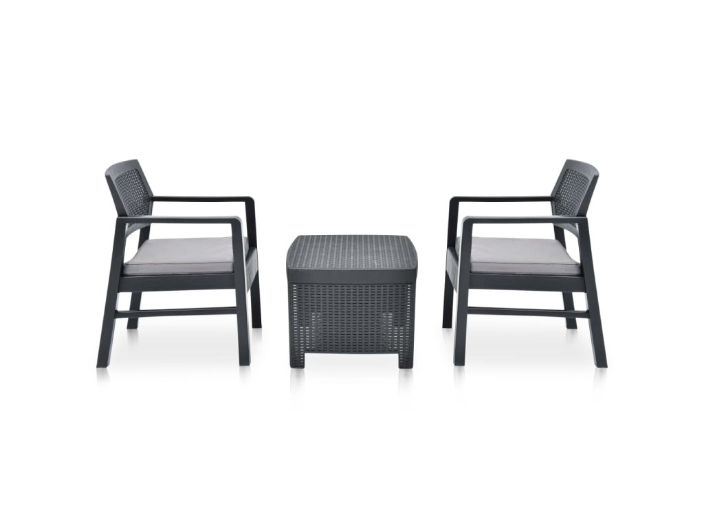 Táto sedacia súprava je vhodná pre použitie v exteriéri vďaka svojmu pevnému, ale ľahkému plastovému materiálu, ktorý je trvácny, odolný voči poveternostným vplyvom a ľahko sa čistí. Sedáky, ktoré sú vyrobené z polyesteru, dodávajú kreslám pohodlie. Montáž súpravy záhradného nábytku je jednoduchá.