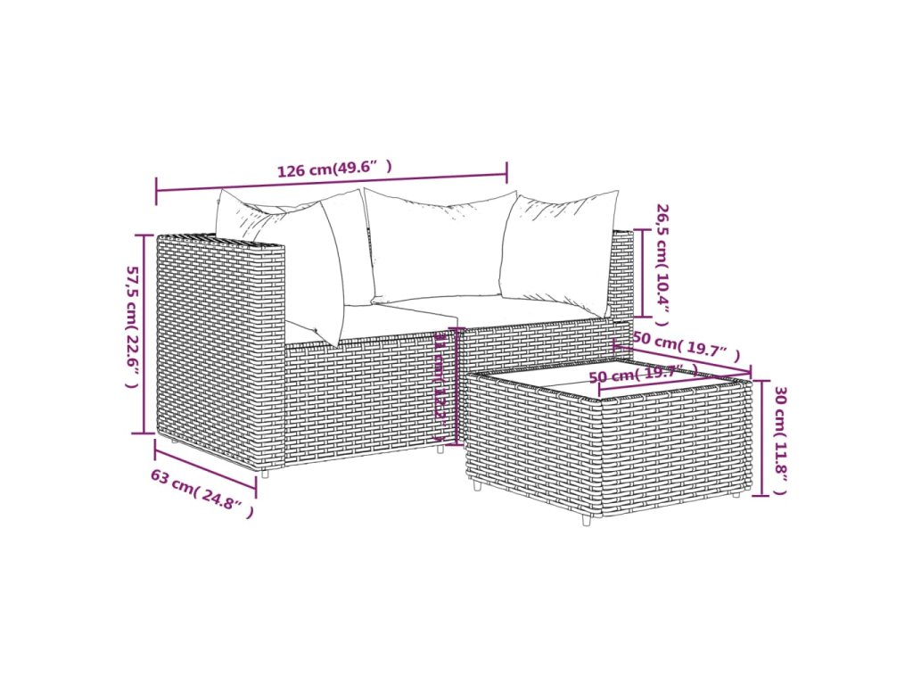 - Materiál: PE ratan, oceľ s práškovým nástrekom, látka (100% polyester), tvrdené sklo