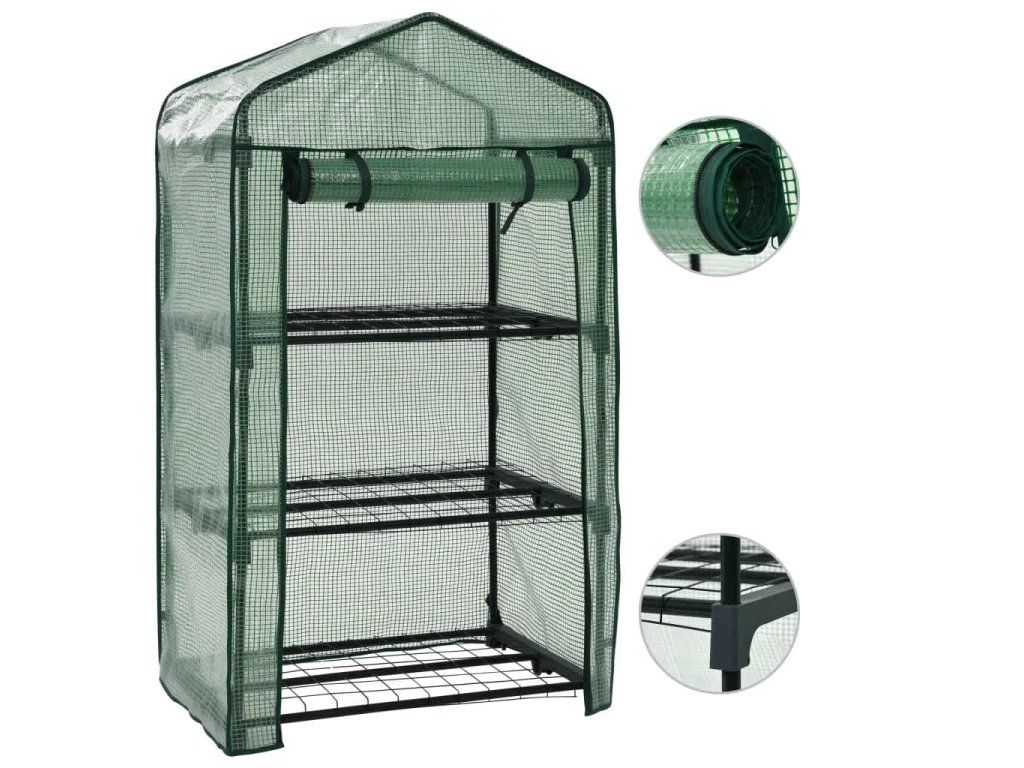 Je vyrobený z odolných a nehrdzavejúcich oceľových trubíc pre zvýšenú stabilitu. Vonkajší kryt je vyrobený z polyetylénu, ktorý zachytáva teplo a chráni jemné rastliny pred nepriaznivým počasím a hmyzom. Bol navrhnutý s rolovacími dverami na zips, ktoré zaisťujú ľahký prístup a vetranie pre optimálnu cirkuláciu vzduchu. Je vybavený troma policami, na ktoré môžete úhľadne umiestniť kvetináče, sadenice a iné záhradnícke potreby.