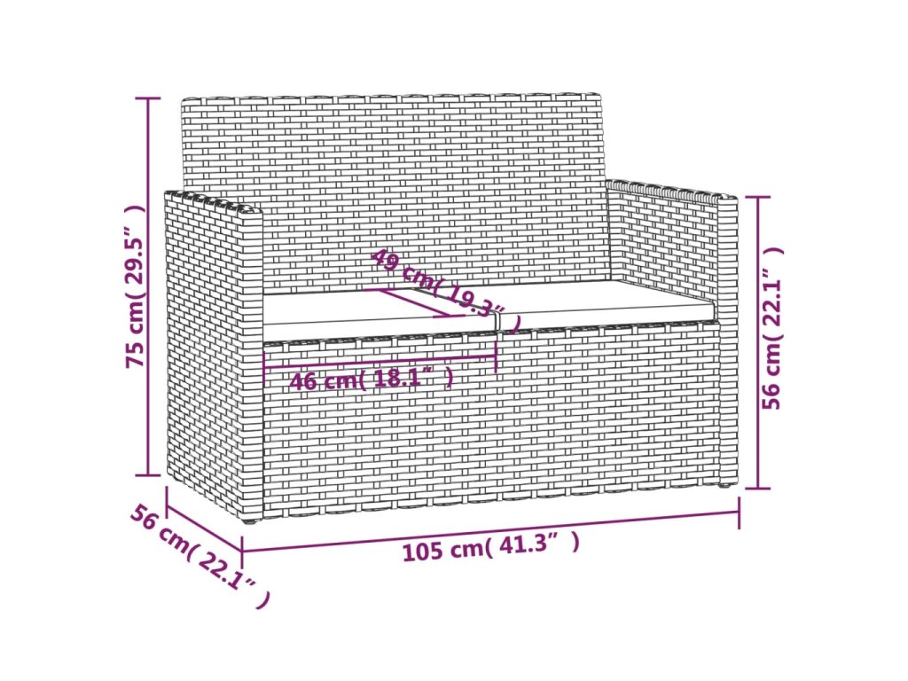 - Rozmery dvojmiestnej pohovky: 105 x 56 x 75 cm (Š x H x V)