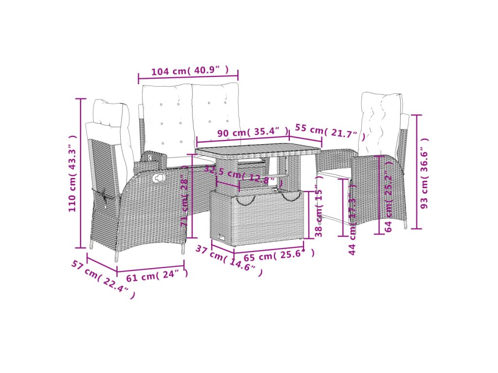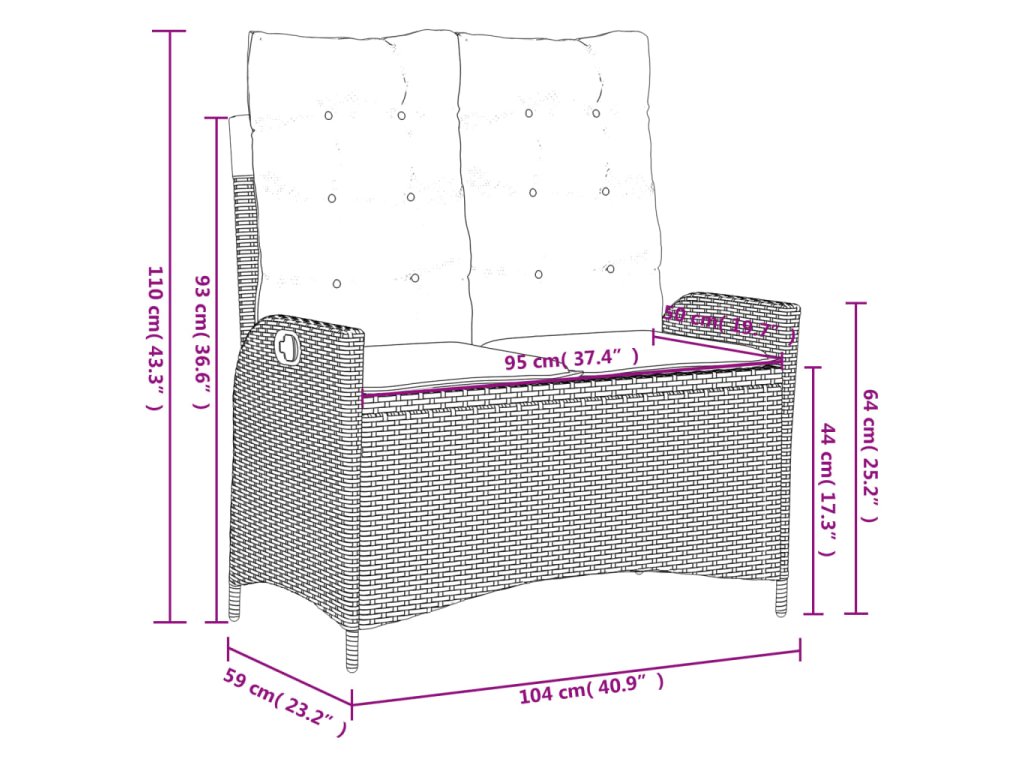 - Rozmery v polohe na sedenie: 104 x 59 x 93 cm (Š x H x V)