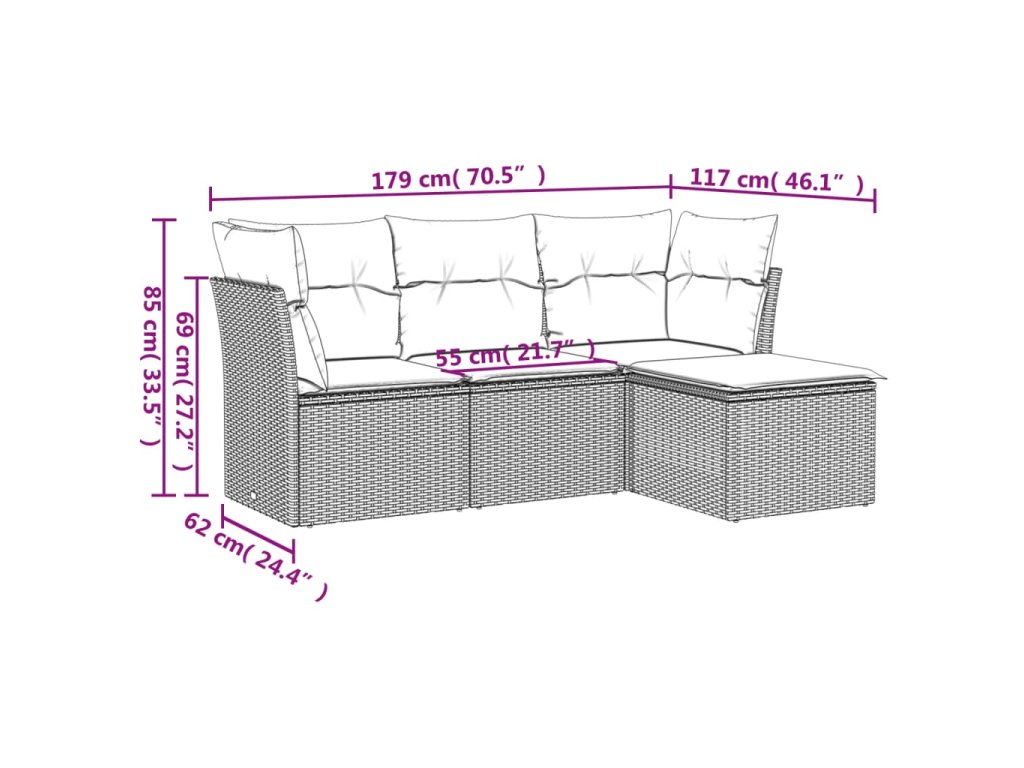 - Celkové rozmery pohovky: 179 x 117 x 69 cm (Š x H x V)