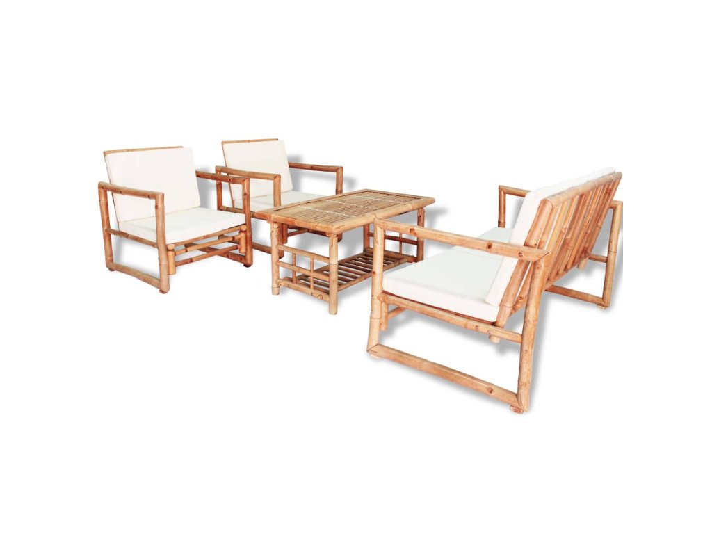 Táto súprava vonkajšieho nábytku je vyrobená z kvalitného bambusu, ktorý sa vyznačuje vynikajúcou trvácnosťou a odolnosťou voči vplyvom počasia. Lavica a stoličky sú pohodlné. Sú ideálne na stolovanie, popíjanie nápojov, alebo iba na čítanie a odpočinok. Na pevný konferenčný stolík si môžete odložiť nápoje, telefón, knihy alebo iné predmety, ktoré potrebujete mať na dosah ruky. Lavica, stoličky a stôl sa dajú ľahko očistiť vlhkou handričkou. Hrubé, odnímateľné sedáky a vankúše na chrbtových opierkiach zvyšujú komfort sedenia.