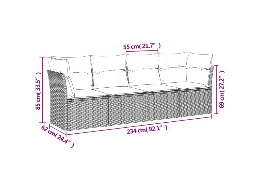 - Celkové rozmery pohovky: 234 x 62 x 69 cm (Š x H x V)