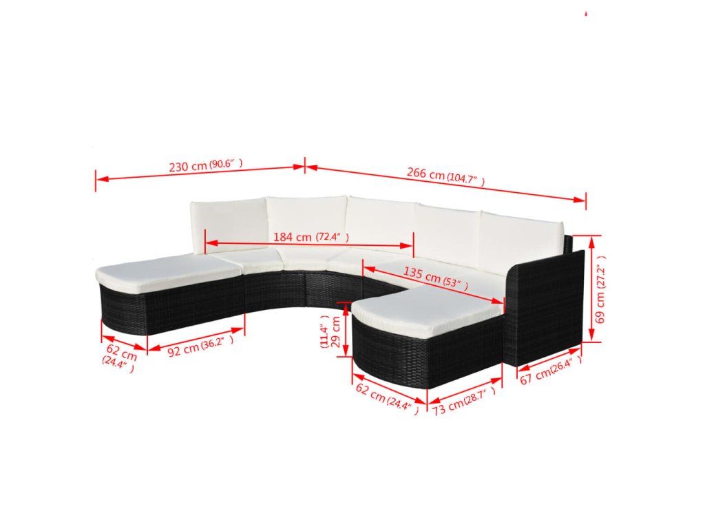 Zásielka obsahuje 2 rohové sedačky, 2 opierky na nohy, 7 podušiek na sedadlá a 5 podušiek na operadlá.