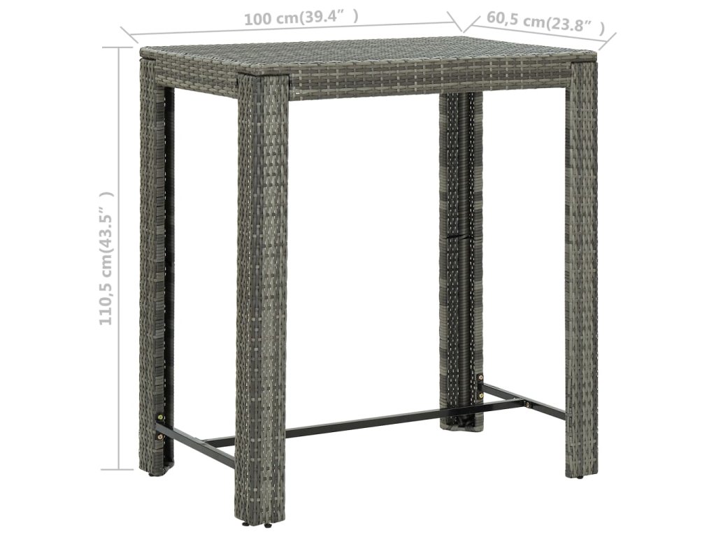 Barový stôl je opatrený oceľovým rámom s práškovanou povrchovou úpravou, vďaka čomu je stabilný a odolný. Stolová doska je ideálna na odloženie nápojov, jedla alebo dekoratívnych predmetov. Stoličky majú pevnú konštrukciu z oceľového rámu a sú vyrobené z PE ratanu odolného voči poveternostným vplyvom, čo zaisťuje ich stabilitu a ľahké premiestňovanie. Opierka nôh dodáva stoličke väčšie pohodlie počas sedenia.