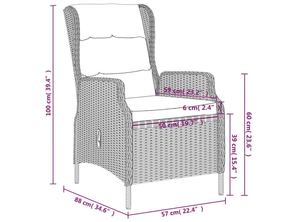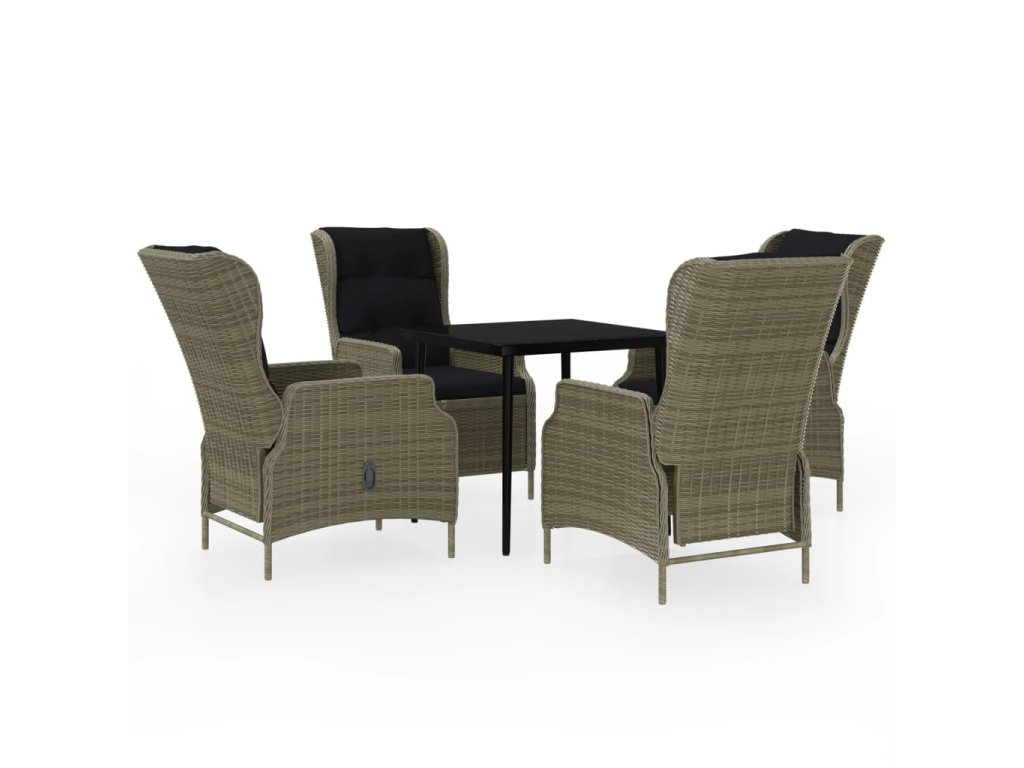 Praktická vonkajšia jedálenská súprava má oceľový rám, vďaka čomu je pevná a odolná. Záhradné polohovacie kreslá sú vyrobené z vodeodolného a bezúdržbového PE ratanu, čím sú ideálne na vonkajšie použitie. Hrubo čalúnené vankúše poskytnú extra pohodlie pri stolovaní. Poťah na vankúš má zips a dá sa oprať. Vďaka plynovému zdvíhaciemu mechanizmu je operadlo stoličky nastaviteľné, aby vyhovovalo vašej polohe. Dotykom tlačidla na boku sa dá operadlo sklopiť do pohodlnej polohy. Hladká sklenená doska stola sa ľahko čistí vlhkou handričkou a je vynikajúca na umiestnenie jedál, nápojov a iných dekoratívnych predmetov.