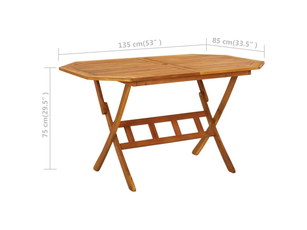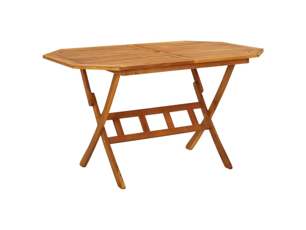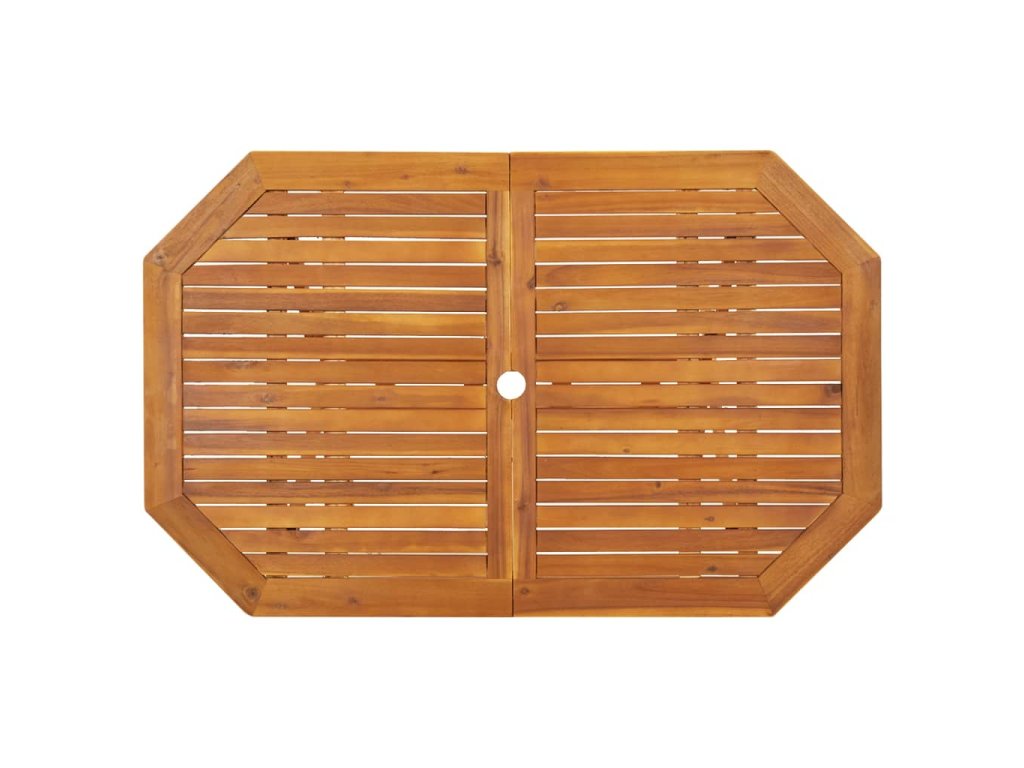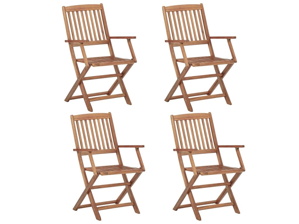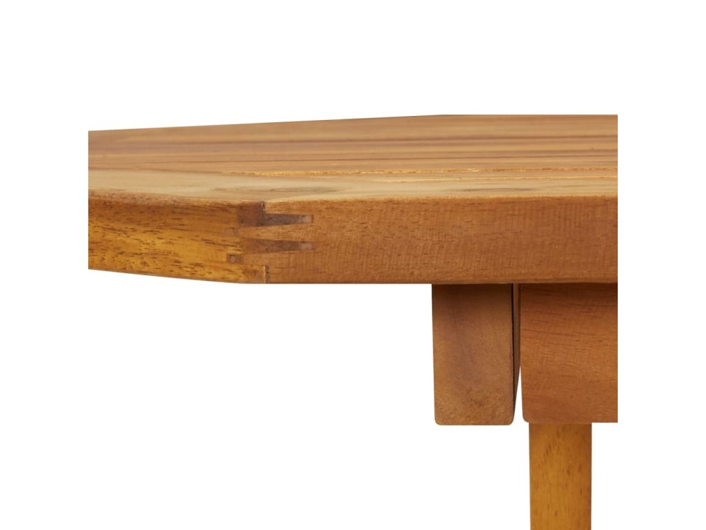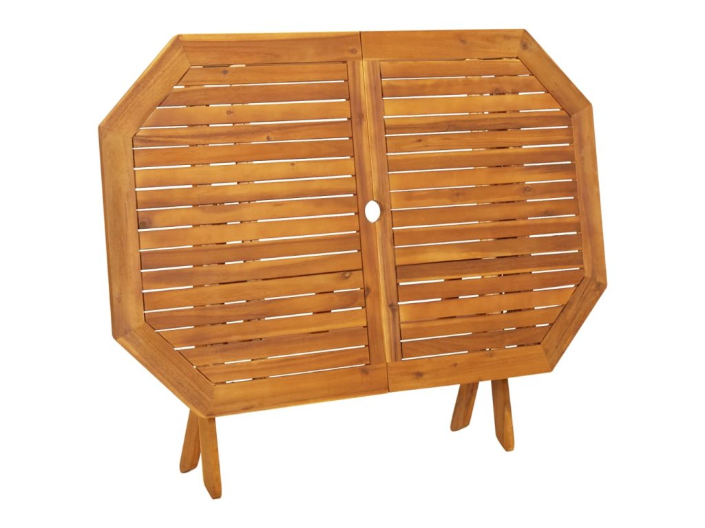 Vonkajšia jedálenská súprava je vyrobená z masívneho akáciového dreva. Ide o drevo tropického listnatého stromu, ktoré sa vyznačuje dobrou odolnosťou voči poveternostným vplyvom a dlhou životnosťou. Povrch s olejovým náterom sa dá ľahko čistiť pomocou navlhčenej handričky. Keď terasový stôl a stoličky nepoužívate, stačí ich poskladať do kompaktnej veľkosti, vďaka čomu ušetríte množstvo priestoru.