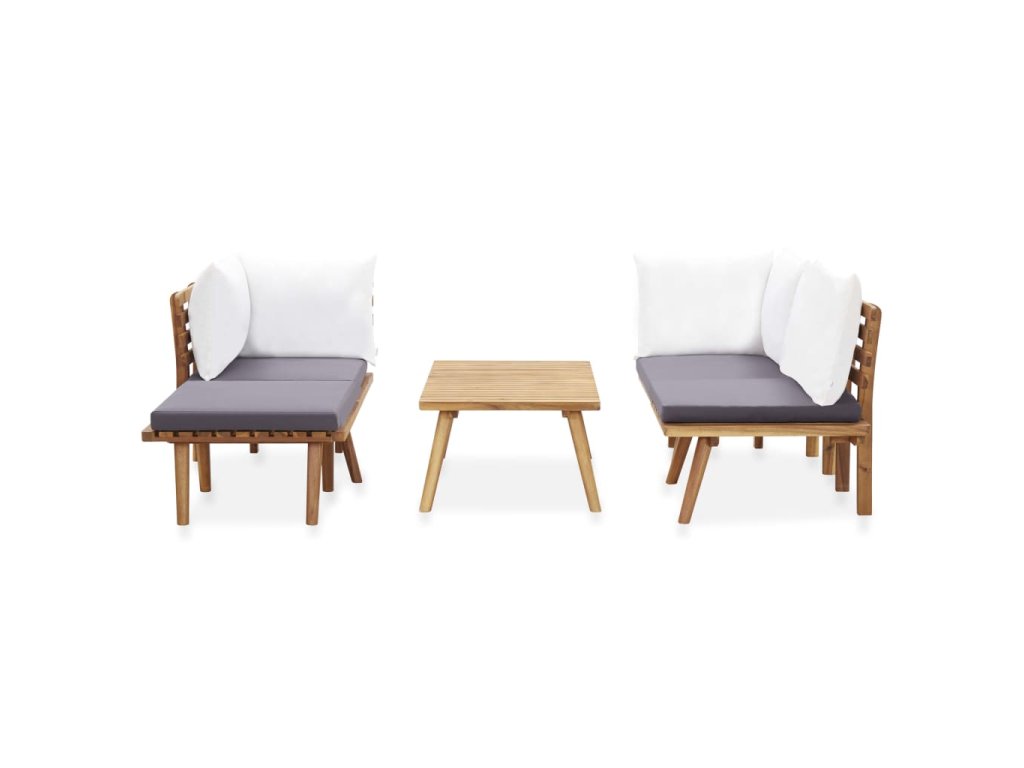 Tento záhradný nábytok je vyrobený z masívneho akáciového dreva, tropického tvrdého dreva, ktoré je odolné voči poveternostným vplyvom a trvácne. Táto súprava sa dodáva aj s pohodlnými sedačkami a vankúšmi za chrbát. Poťahy na vankúše sú odnímateľné a dajú sa oprať. Záhradný nábytok si vyžaduje montáž.