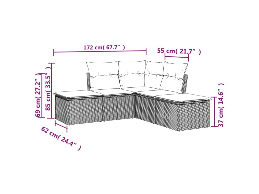 - Celkové rozmery 5-miestnej pohovky: 172 x 172 x 69 cm (š x h x v)