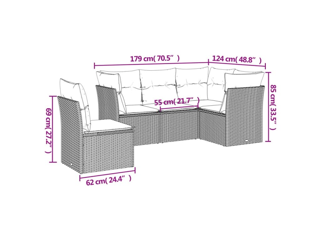 - Celkové rozmery 4-miestnej pohovky: 179 x 124 x 69 cm (Š x H x V)