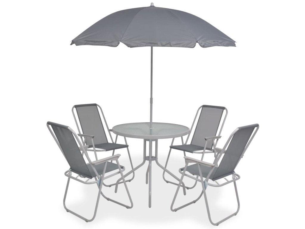 Zásielka zahŕňa 4 stoličky, 1 stôl a 1 slnečník.