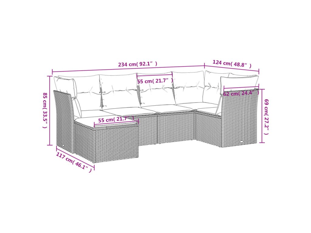 - Celkové rozmery pohovky: 234 x 124 x 69 cm (Š x H x V)