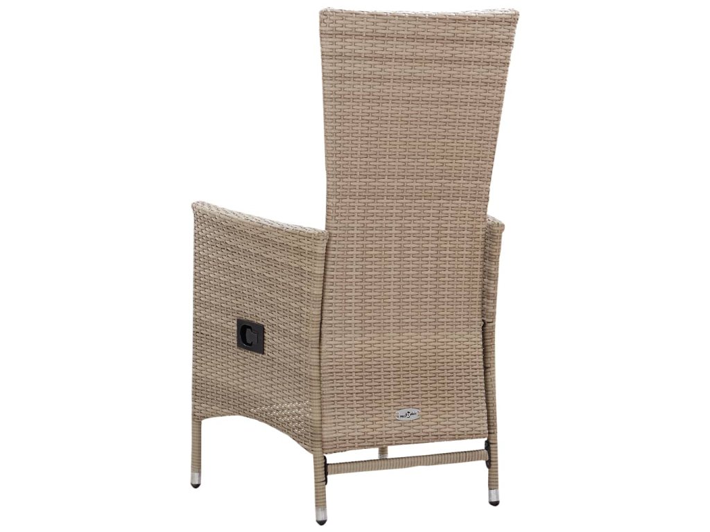 Jedálenský stôl je vyrobený z masívneho akáciového dreva, vďaka čomu je pevný a stabilný. Vďaka olejmi upravenému povrchu je vhodný aj na vonkajšie použitie. Jedálenské stoličky s oceľovým rámom potiahnutým PE ratanom odolným voči poveternostným vplyvom sú pevné a ľahko sa čistia. Stlačením tlačidla sa dá operadlo sklopiť dole. Husto polstrované podušky tiež dodávajú extra pohodlie pri sedení.