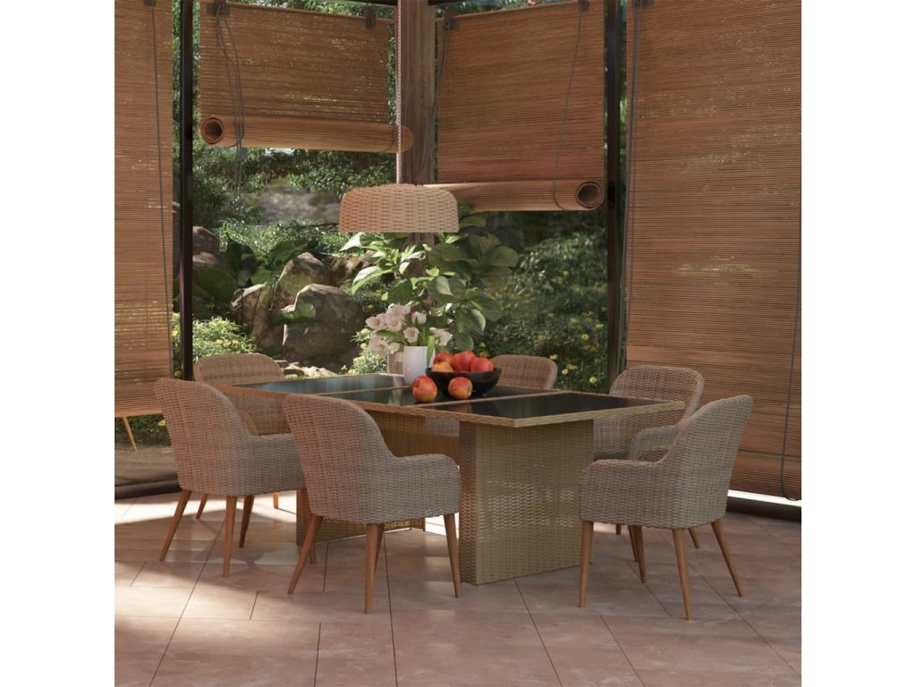 Vonkajší nábytok má oceľový rám s práškovaným povrchom, ktorý zaručuje stabilitu a odolnosť. Jedálenská súprava je vyrobená z odolného PE ratanu, vďaka čomu je pevná, odolná voči vplyvom počasia, ľahko čistiteľná a vhodná na každodenné vonkajšie používanie. Sklenený vrch stola sa jednoducho čistí pomocou vlhkej handričky. Navyše, mäkké sedáky sú skutočne pohodlné. Návliečky z polyesteru si vyžadujú iba nízku údržbu a jednoducho sa dajú zvliecť a oprať.