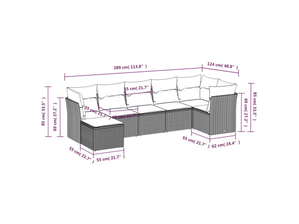- Celkové rozmery pohovky: 289 x 124 x 69 cm (Š x H x V)