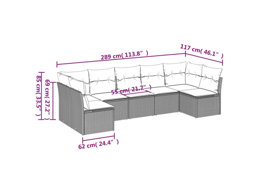 - Celkové rozmery pohovky: 289 x 117 x 69 cm (Š x H x V)