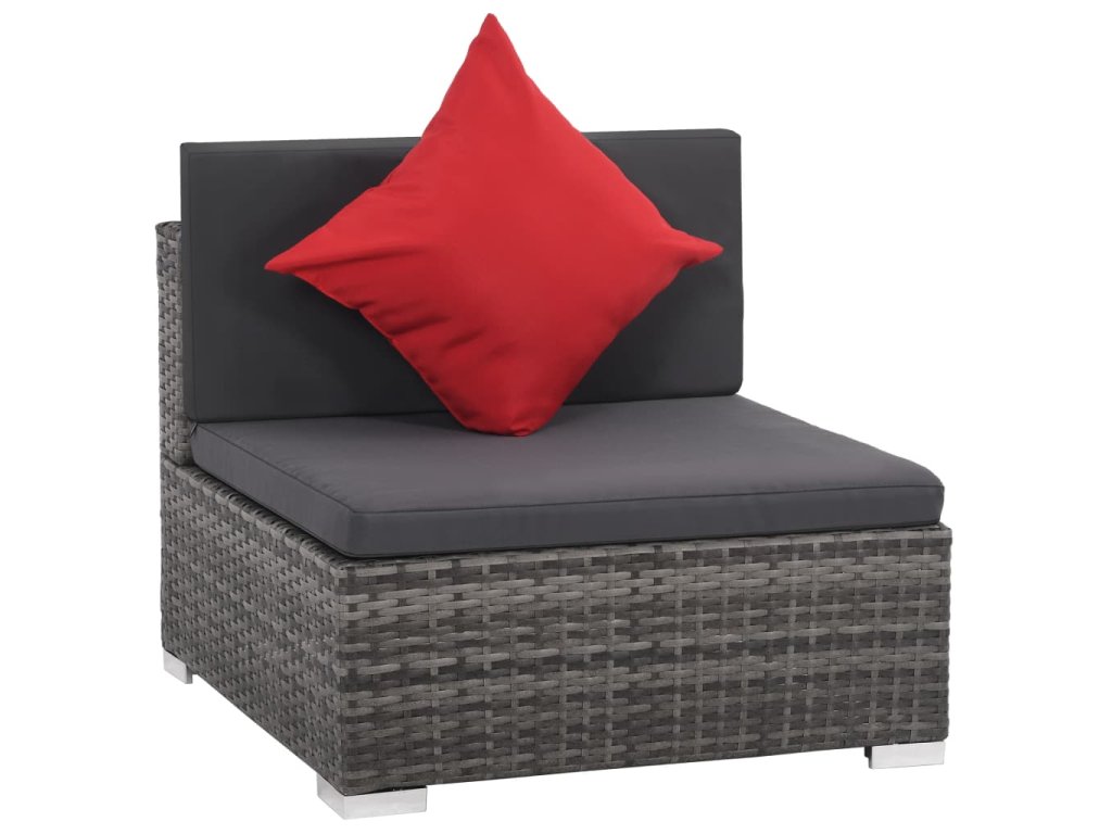 Táto polyratanová sedacia súprava pozostáva z 2 rohových pohoviek, 3 stredových pohoviek, 1 konferenčného stolíka, 2 polkruhových taburetiek, 5 výrazných červených vankúšov a 14 podložiek a poskytne vám štýlové sedenie na záhradu alebo na terasu.