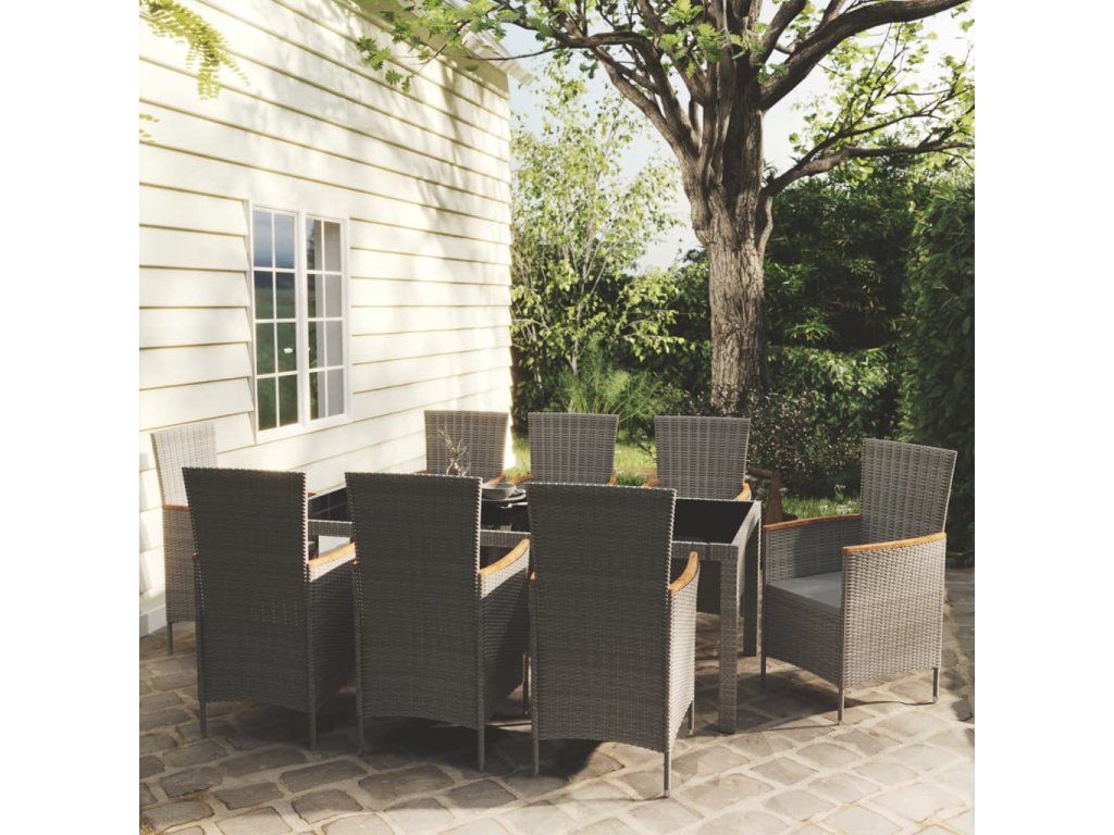 vidaXL 9-dielna vonkajšia jedálenská súprava + podložky polyratan sivá