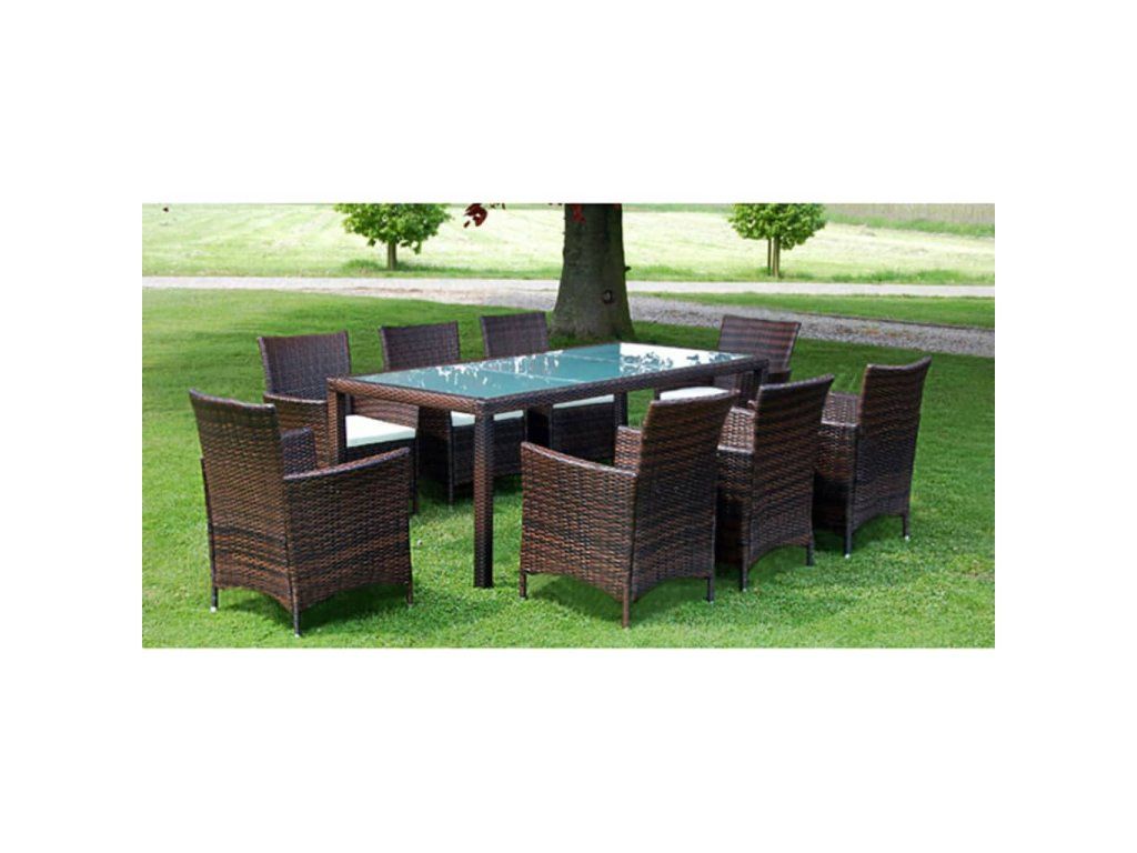 V balení sa nachádza 1 stôl so sklenenou doskou, 8 ratanových stoličiek a 8 odnímatených sedákov, celkovo 17 kusov.