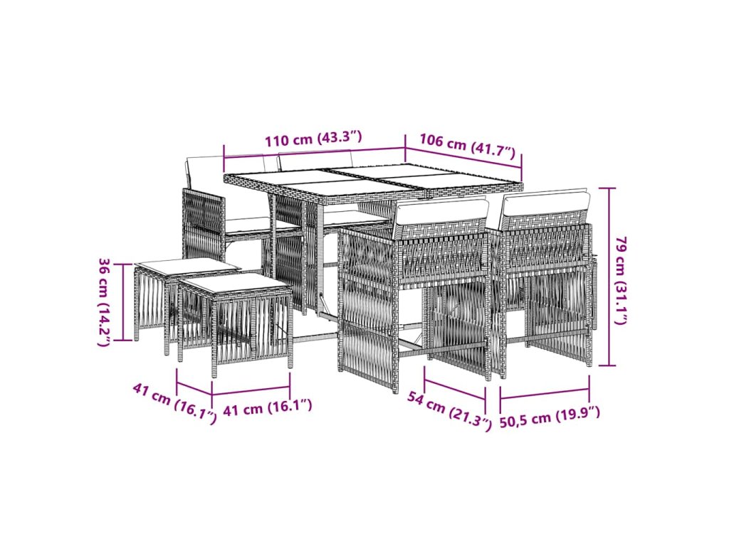 - Materiál: PE ratan, oceľ s práškovou povrchovou úpravou, tvrdené sklo