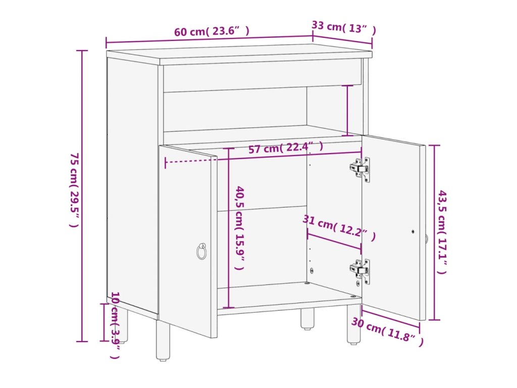 - Pevné nohy: Železné nohy dodávajú bočnej skrinke robustnosť a stabilitu.