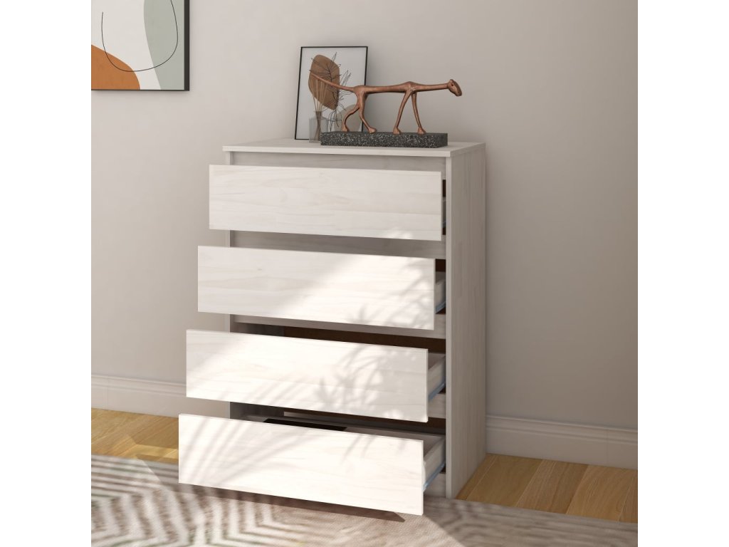 Zásuvková skrinka je vyrobená z masívneho borovicového dreva, vďaka čomu je stabilná a odolná. Úložná skrinka so 4 zásuvkami poskytuje dostatok úložného priestoru na knihy, oblečenie a iné predmety. Jej pevná doska je ideálna na vystavenie dekoratívnych predmetov, fotorámikov alebo rastlín v črepníkoch.
