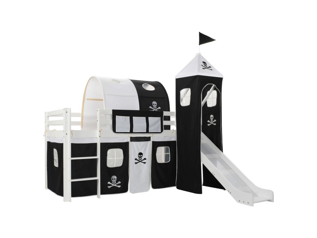 Vaše dieťa si užije hranie sa a spanie v tejto poschodovej posteli s pirátskou tématikou, ktorá má šmykľavku, rebrík, stan a plátenú strechu.