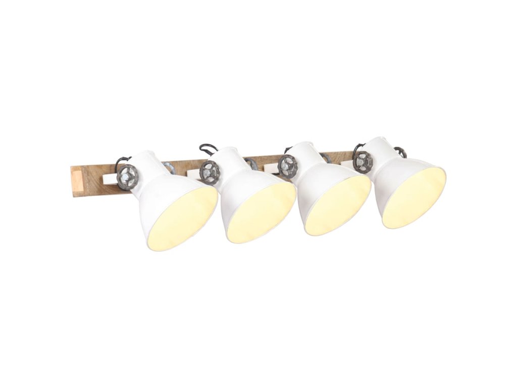 Železné tienidlá s bielou povrchovou úpravou a z masívneho mangovníkového dreva s povrchovou úpravou v zvetranej hnedej sa perfektne hodí do interiéru vo vidieckom alebo priemyselnom štýle. Stropné svietidlo so 4 tienidlami má objímku E27 pre žiarovku s maximálne 25 wattmi. Môžete si vybrať a nainštalovať žiarovky E27 s rôznymi farbami svetla, ktoré vytvárajú atmosféru relaxácie a pokoja.