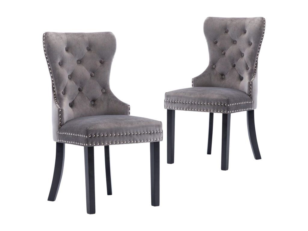 Tieto jedálenské stoličky, čalúnené zamatovou látkou príjemnou na dotyk, poskytujú pohodlné miesto pre stolovanie, čítanie alebo len pre oddych. Dekoratívny gombík na operadle a kovové nity pozdĺž okrajov dodávajú stoličke klasickú krásu. Jedálenské sedačky majú pevné nohy z kaučukovníkového dreva a sú stabilné a pevné.
