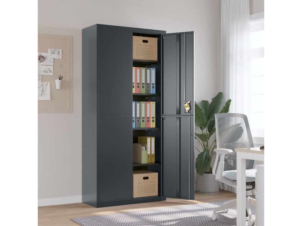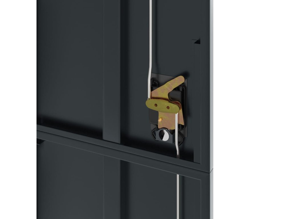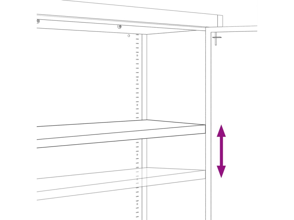 - Nastaviteľné police: Úložná skrinka obsahuje 4 nastaviteľné police, ktoré vám umožňujú prehľadne triediť šanóny do rôznych kategórií.