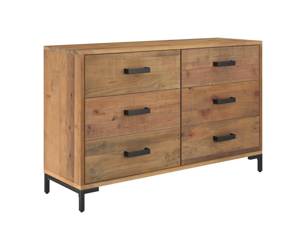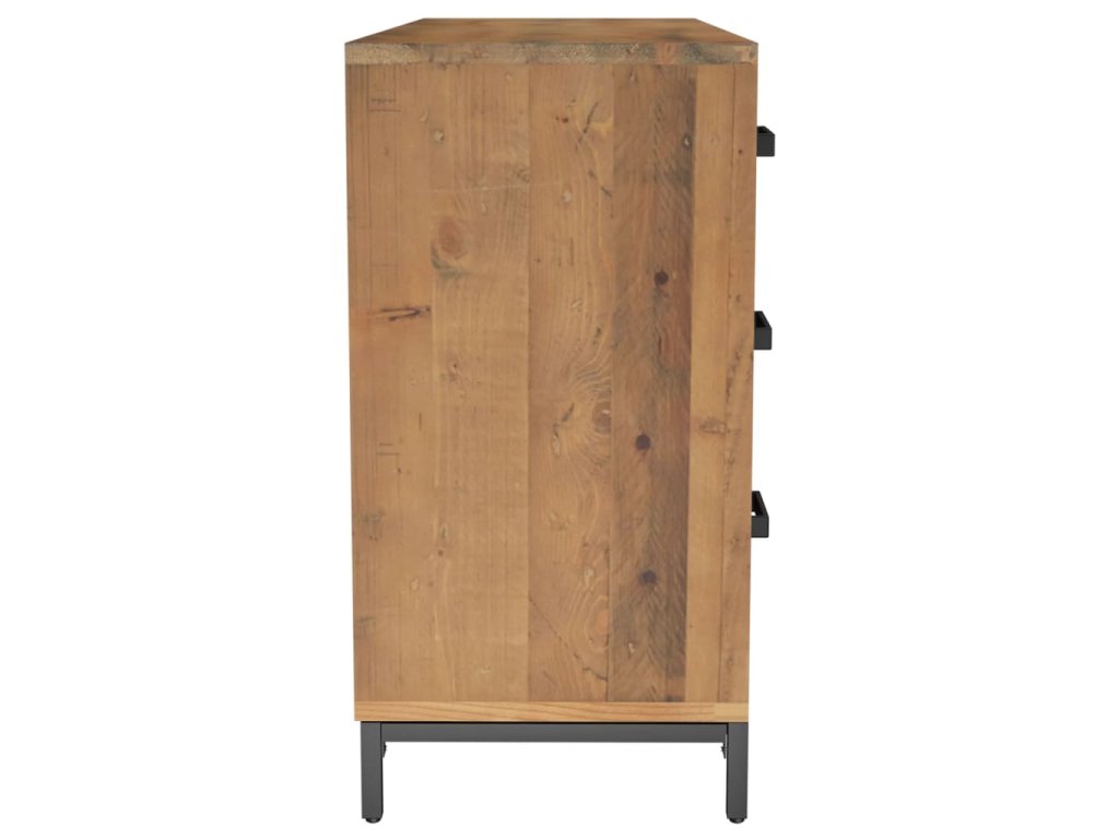 - Masívne recyklované borovicové drevo: Skrinka je vyrobená z recyklovaného masívneho borovicového dreva, ktoré má drsné hrany, chyby a škrabance, čo mu dodáva vintage priemyselný vzhľad.