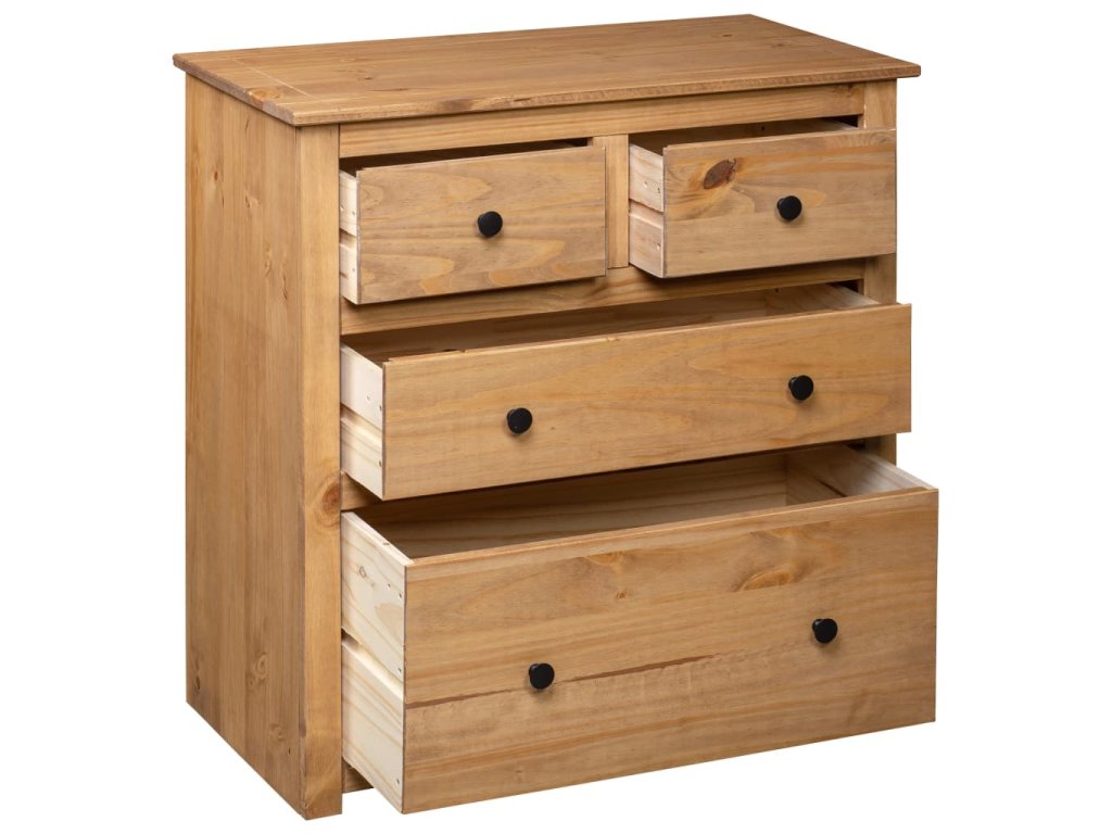 Komoda navrhnutá so 4 zásuvkami udržuje vaše časopisy, knihy, DVD a multimediálne zariadenia dobre usporiadané a na dosah ruky. Pevný vrchná doska je ideálna na umiestnenie dekoratívnych predmetov, ako sú vázy alebo kvetináče. Skrinka je vyrobená z borovicového masívu. Každý krok procesu výroby sa vykonáva s najväčšou starostlivosťou, či už ide o leštenie, natieranie alebo lakovanie. Vďaka vynikajúcemu remeselnému spracovaniu a esteticky príťažlivej štruktúre dreva je každý kus nábytku jedinečný a mierne sa odlišuje od ostatných.